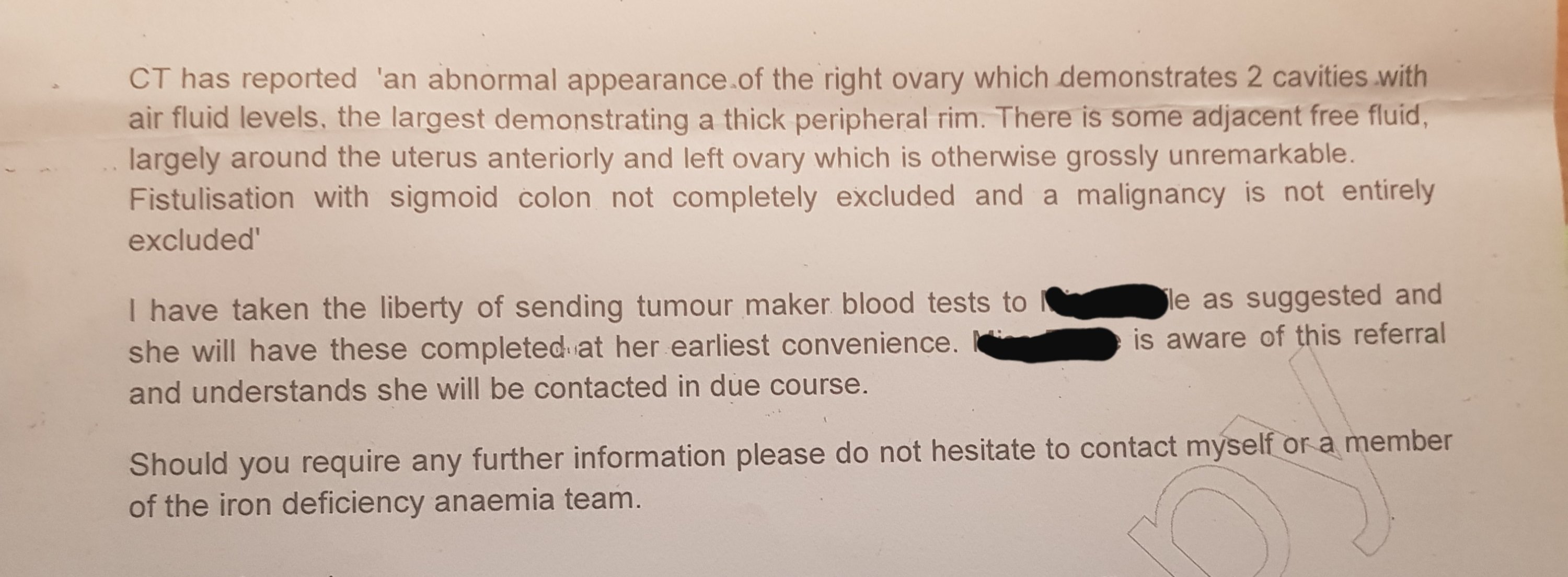 I got 2 letters on 21st January (dated 14th January), one with the result of the CT, and the other a copy of the urgent referral to gynae. My abnormal ovary is the right one. I’ve also had another CA125 blood test (on 19th January). From the endoscopy onwards, its all been “urgent”.
